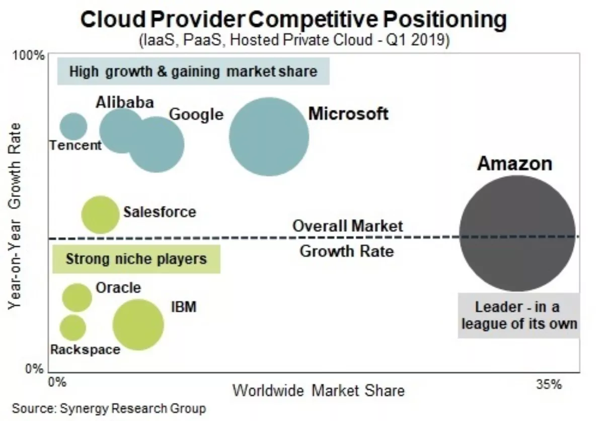 Another group of four cloud providers have substantial market share but are somewhat niche players and typically have lower growth rates – IBM, Salesforce, Oracle and Rackspace.