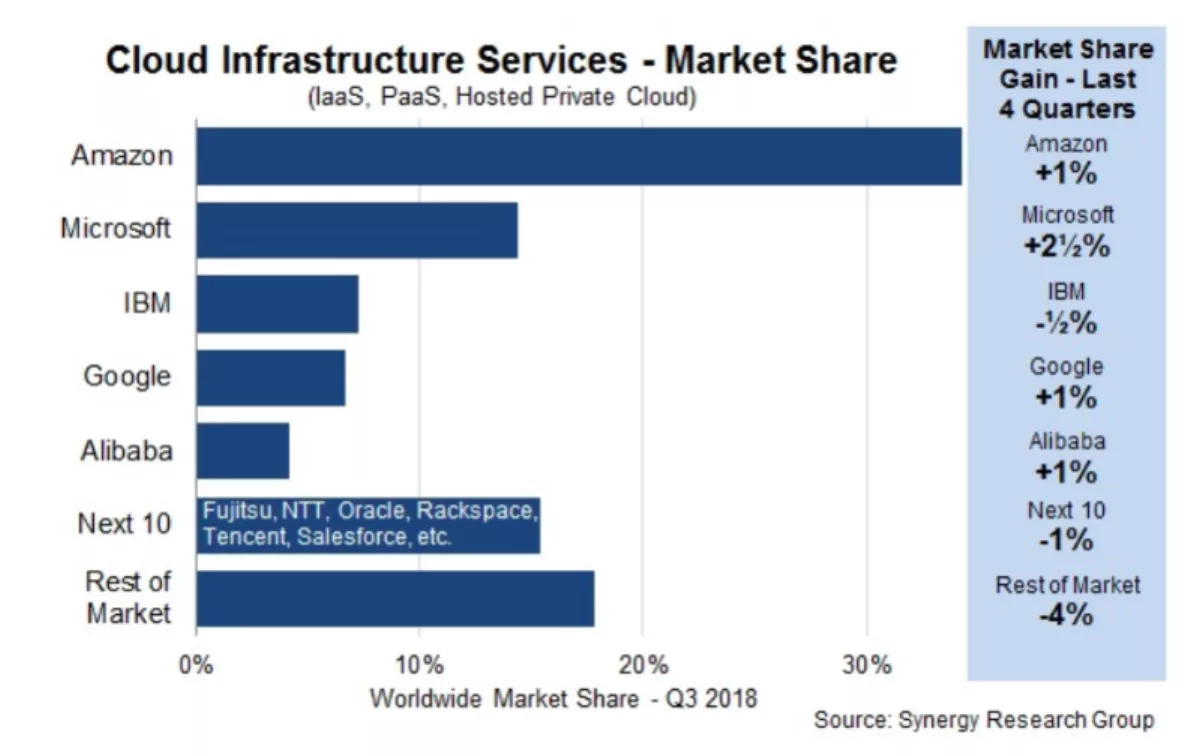 Looking deeper within the market, the 45 percent growth rate from the third quarter of 2018 compares with a 44 percent growth rate from the whole of 2017 and 50 percent for the whole of 2016. The biggest revenue earners within the market for the third quarter was Public IaaS and PaaS services, growing by 51 percent.