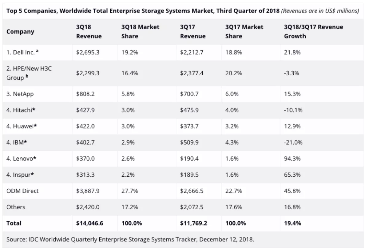 According to the International Data Corporation (IDC), vendor revenue in the worldwide enterprise storage systems market surged 19.4 percent year-over-year during the third quarter of 2018.