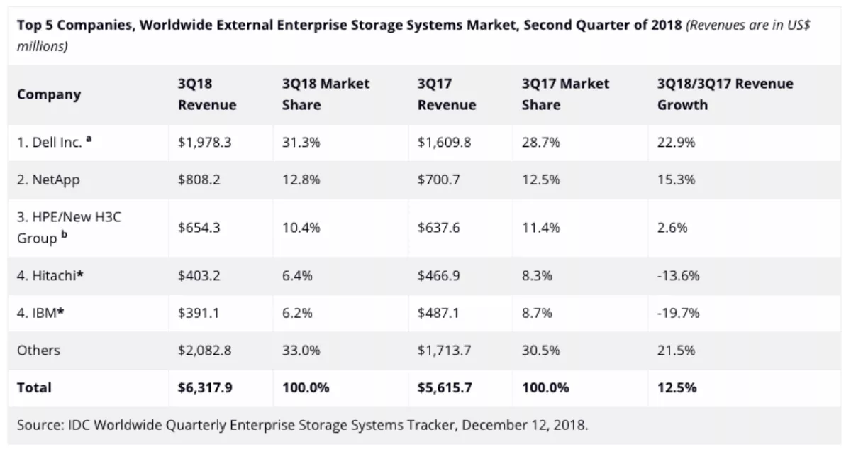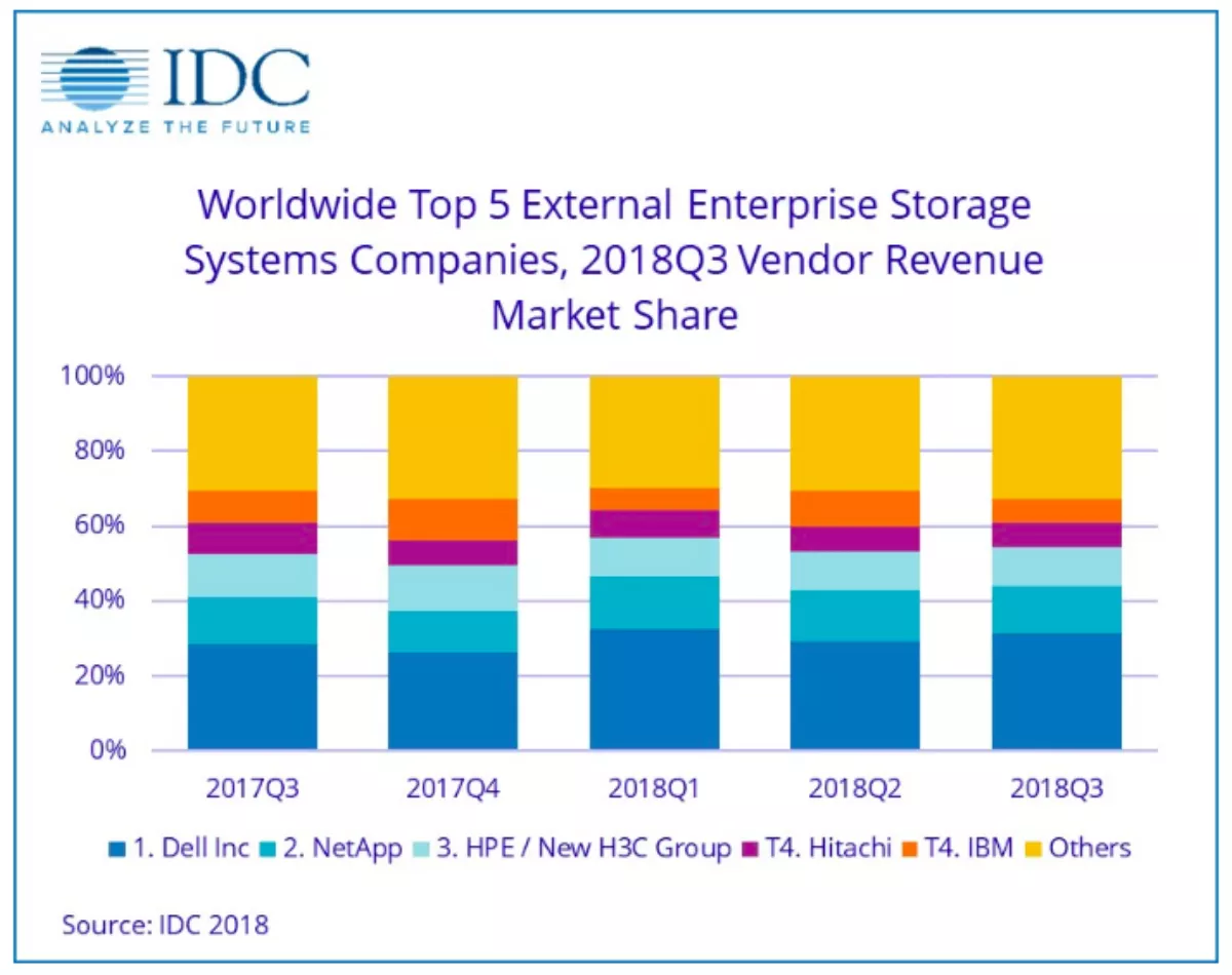 Dell dominated the external enterprise storage system market during the quarter, accounting for 31.3 percent of global revenues. Way back in second place was NetApp on 12.8 percent, followed by HPE/New H3C Group on 10.4 percent, and Hitachi and IBM on a statistical tie with 6.4 percent and 6.2 percent respectively.