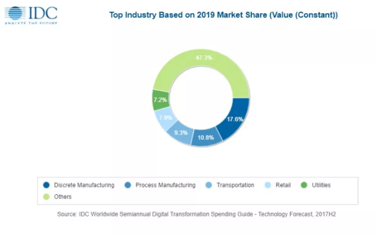 According to IDC, four industries will be the major drivers of this growth and will account for almost half of the $1.25 trillion in worldwide DX spending in 2019. These are discrete manufacturing with $220 billion, process manufacturing with $135 billion, transportation with $116 billion, and retail $98 billion.