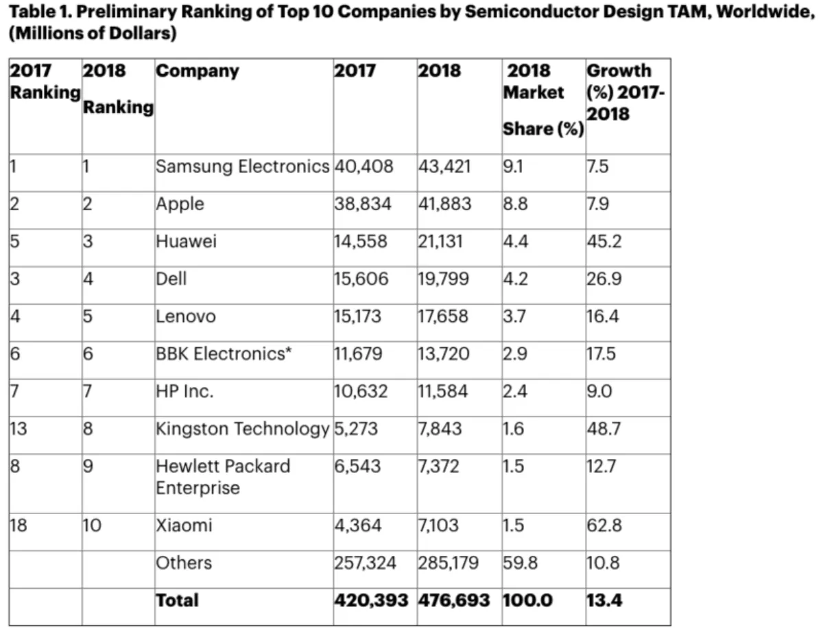 Eight of the top 10 companies from 2017 remained in the top 10 in 2018, with LG Electronics and Sony being ousted by Kingston Technology and Xiaomi - the latter company rose eight places to reach 10th place after increasing its semiconductor spending $2.7 billion in 2018, a 63 percent year-on-year growth.
