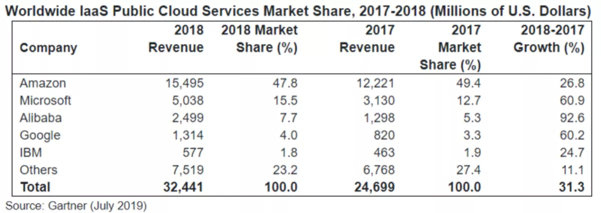 Amazon, Microsoft, Alibaba, Google and IBM are still the undisputed heavyweights of the public cloud infrastructure-as-a-service (IaaS) market, according to the latest figures from Gartner.