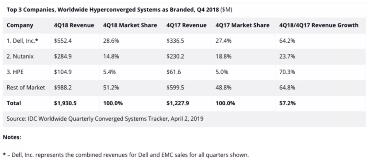 As it relates to the branded view of the hyperconverged systems market, Dell, Inc. was the largest supplier in 4Q18 with $552.4 million in revenue and a 28.6% share of the market. Nutanix generated $284.9 million in branded revenue, which represents 14.8% of the total HCI market during the quarter and 49% of the total HCI revenue generated through sales of systems running Nutanix software. HPE was the third largest branded HCI vendor with $104.9 million in revenue and 5.4% market share.