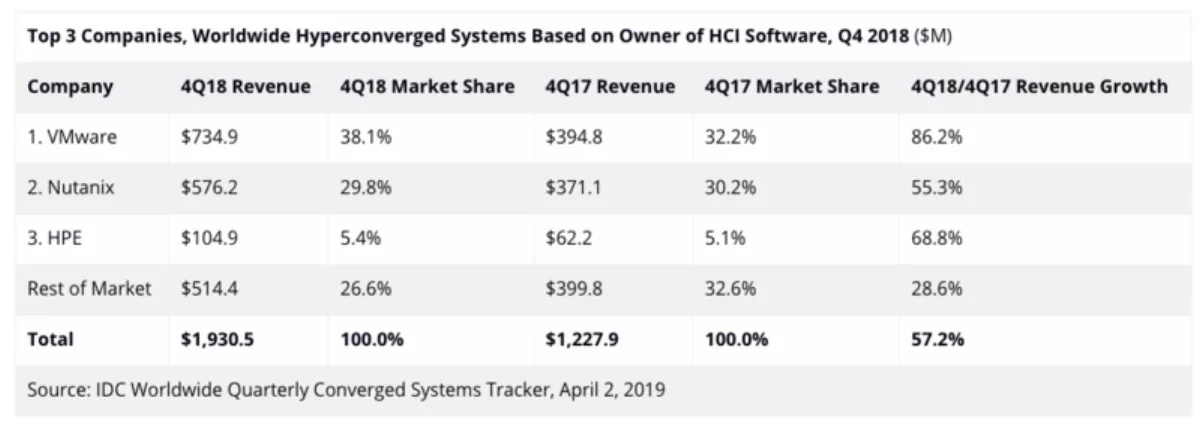 From the software ownership view of the market, systems running VMware hyperconverged software represented $734.9 million in total fourth quarter vendor revenue or 38.1% of the total market. Systems running Nutanix hyperconverged software represented $576.2 million in fourth quarter vendor revenue or 29.8% of the total market. Both amounts represent sales of all HCI software and hardware regardless of how it was branded.