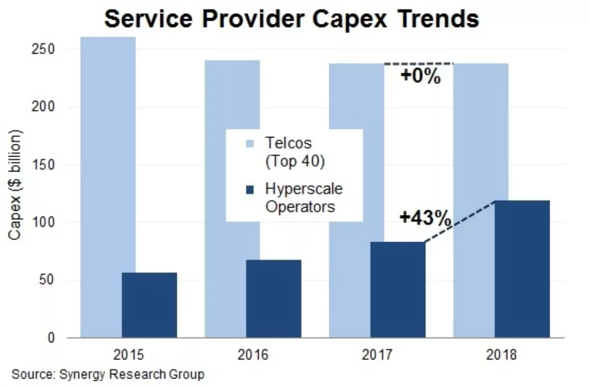 In terms of the vendors with the biggest pockets, the top five hyperscale spenders in 2018 were Google, Amazon, Microsoft, Facebook, and Apple. Interestingly, their aggregate 2018 CAPEX was almost identical to the CAPEX of the top five telco spenders - China Mobile, AT-T, Verizon, NTT, and Deutsche Telekom.
