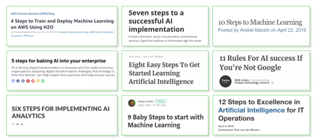The promise of analytics and machine learning is fantastic but we still have a lot to learn. The image below of headlines summarizes a cursory online search about how to deploy AI. Let's see… we have 4 training steps, 5 baking steps, 6 implementation steps, 7 steps to  successful AI, 8 easy steps to get started, then there's 9 baby steps, 10 learning steps, 11 rules, and don't forget the 12 steps to excellence.