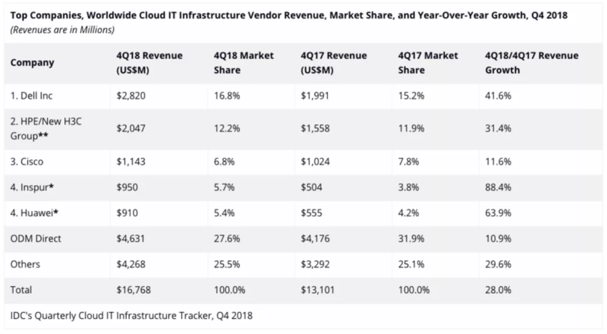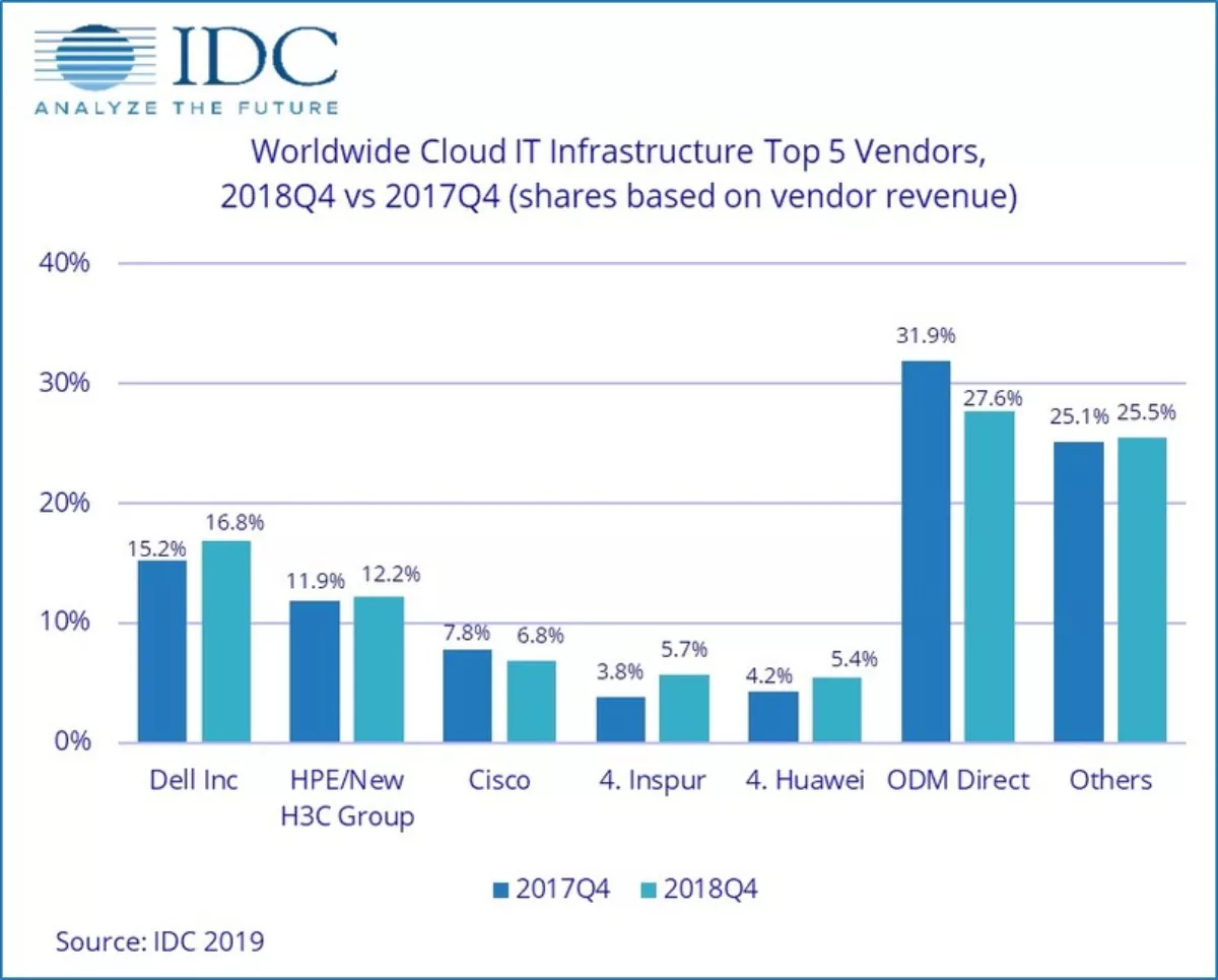 Dell, HPE, Cisco, Inspur, and Huawei are the top five vendors with the biggest claims of the cloud IT infrastructure market in terms of revenue.
